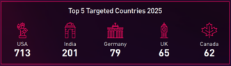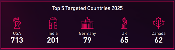 El informe destaca que Estados Unidos lidera el ranking de países afectados con 713 incidentes, seguido de India (201), Alemania (79) Reino Unido (65) y Canadá (62%). Esto demuestra que las potencias industriales son el foco principal de estas campañas.
